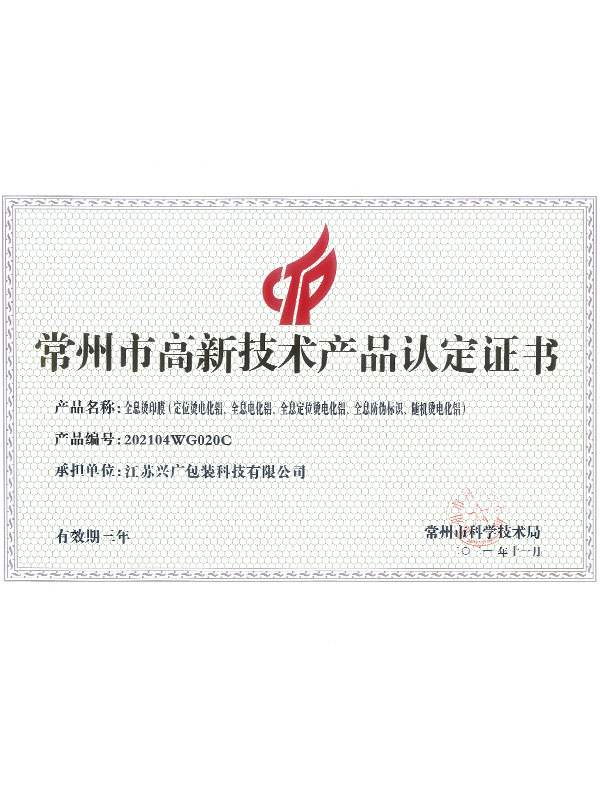 江苏兴广包装科技有限公司成立于2015年4月15日,地处风景宜人的太湖之滨----江苏省常州市武进国家高新技术产业开发区,即为科研开发、生产制造、市场营销于一体的国家高新技术企业,是一家生产全息防伪定位烫印标识产品的专业性公司。